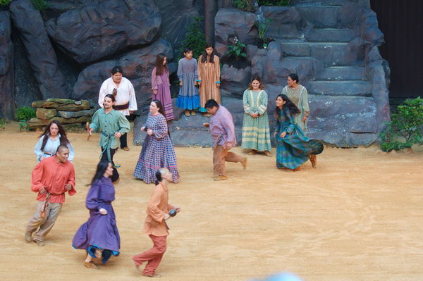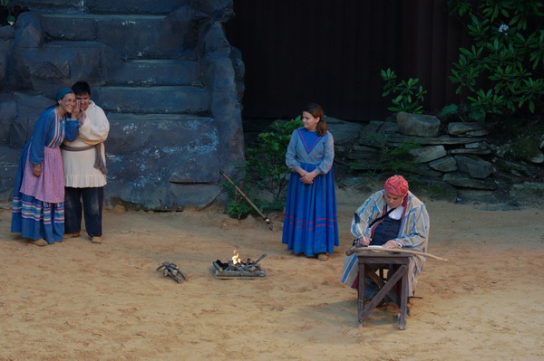 ... as well as the dramatic moments when Tecumseh, a powerful Shawnee (to the right), urges the Cherokee people and their Chief Junaluska to go to war against white settlers who were invading more and more Indian territories despite the peace treaty which stipulated that settlers were not to go beyond the Appalachians. The greatest misfortune for the Cherokee began after the American Revolution when the "Indian Removal Act” was signed by Congress. More than 4 000 Cherokees died from hunger, cold and disease throughout the forced exile to the western plains.
