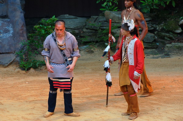 ..., que les instants dramatiques quand Tecumseh un puissant Shawnee (à droite) exhorte les Cherokee et leur chef Junaluska à rentrer en guerre contre les colons blancs qui envahissent de plus en plus les territoires indiens malgré les traités de paix qui stipulaient que les colons de dépasseraient pas les Appalaches. Le plus grand malheur des Cherokee a commencé après la révolution Américaine lorsque que le "Indian removal Act" (l'Acte d'exil des indiens) a été signé par le congrès. Plus de 4 000 Cherokees sont morts de faim, de froid et de maladie tout le long de l'exil forcé vers les plaines de l'Ouest.