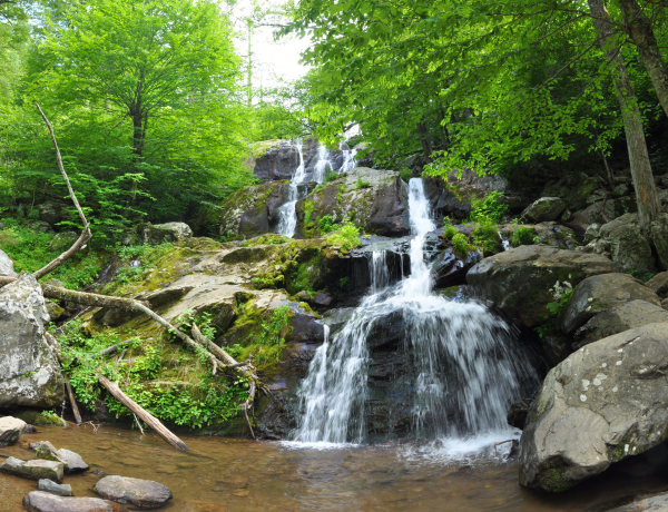 El "Dark Hollow Falls" en el Parque Nacional Shenandoah son fácilmente accesibles en una marcha corta.