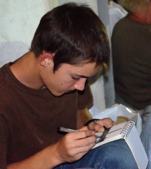 En attendant le feu d'artifice, Cylia et Nathalie discutent et Mathieu dessine.
